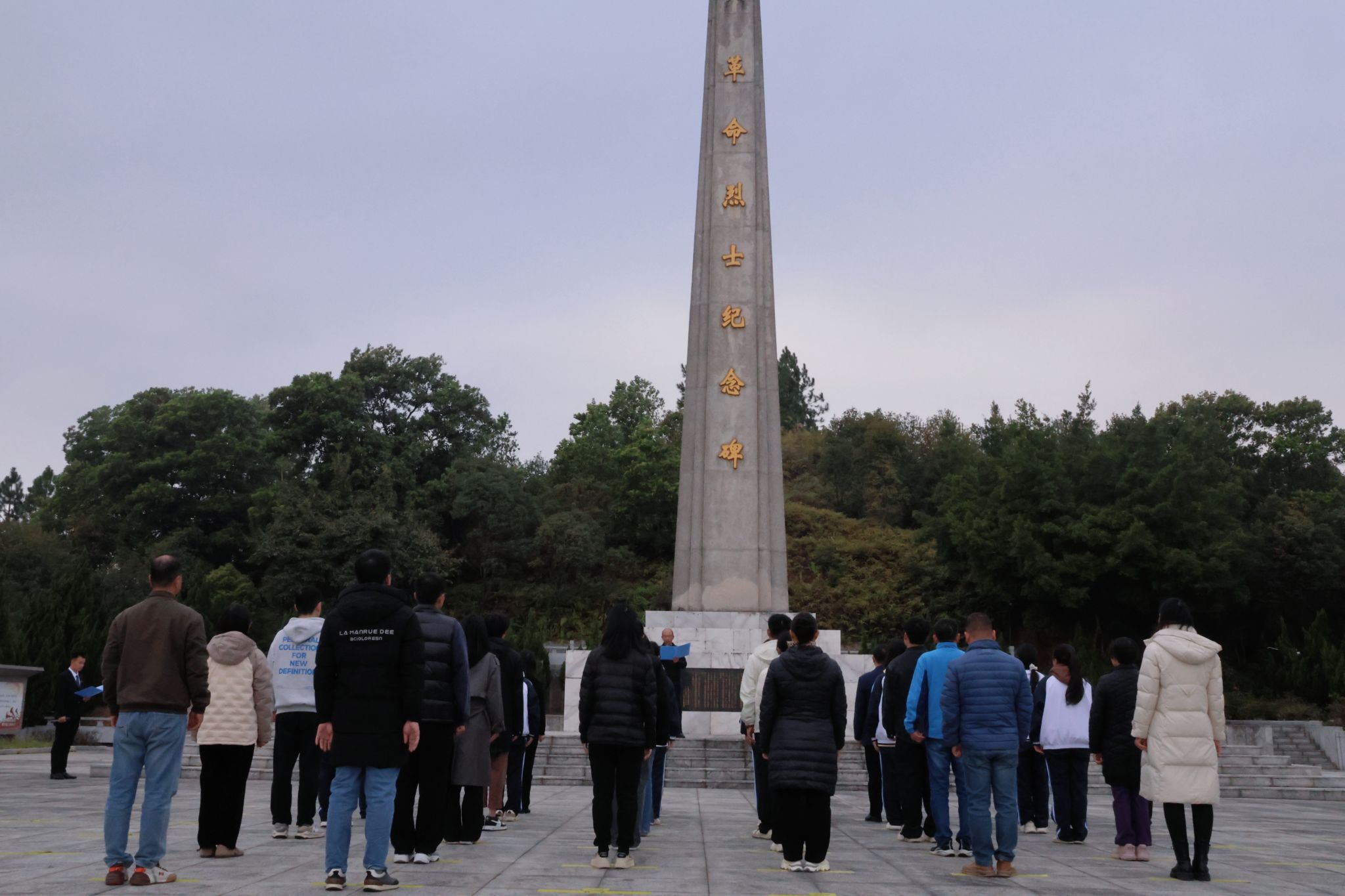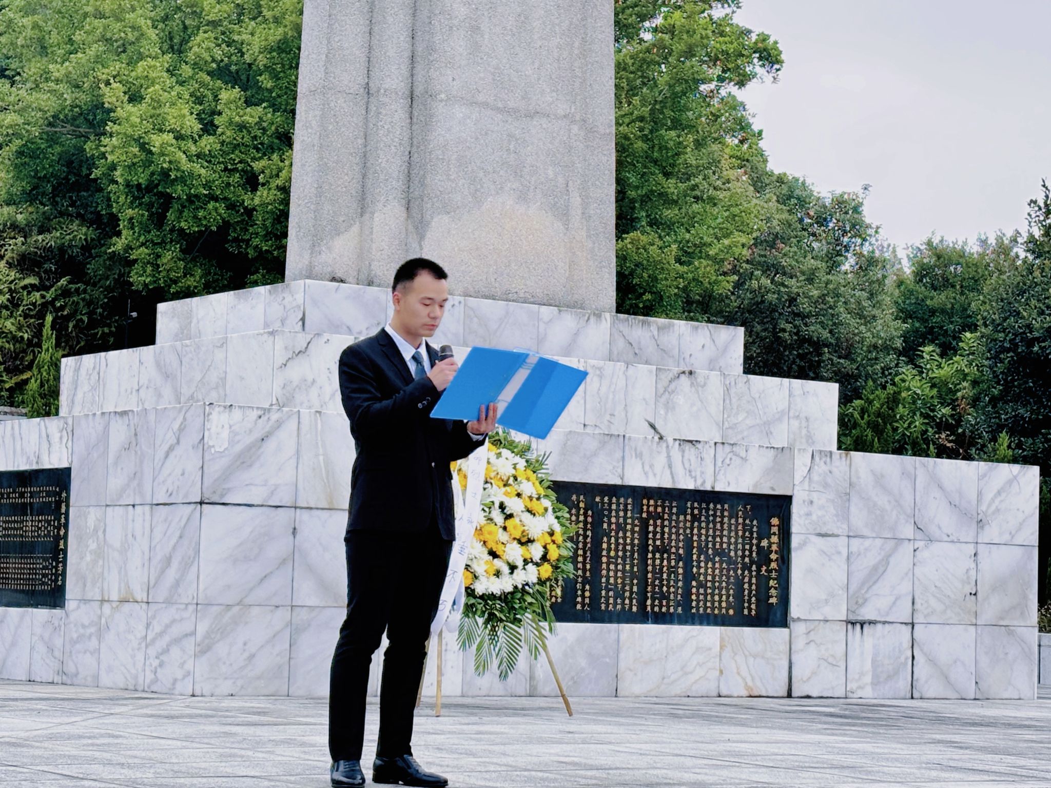 在庄严肃穆的烈士陵园内,活动有序进行。支部组织委员张琦向烈士纪念碑行鞠躬礼,宣布仪式开始。他先阐述了精神谱系内涵与国家公祭日的意义,强调了铭记历史、传承精神对当代社会和国家发展的重要性。