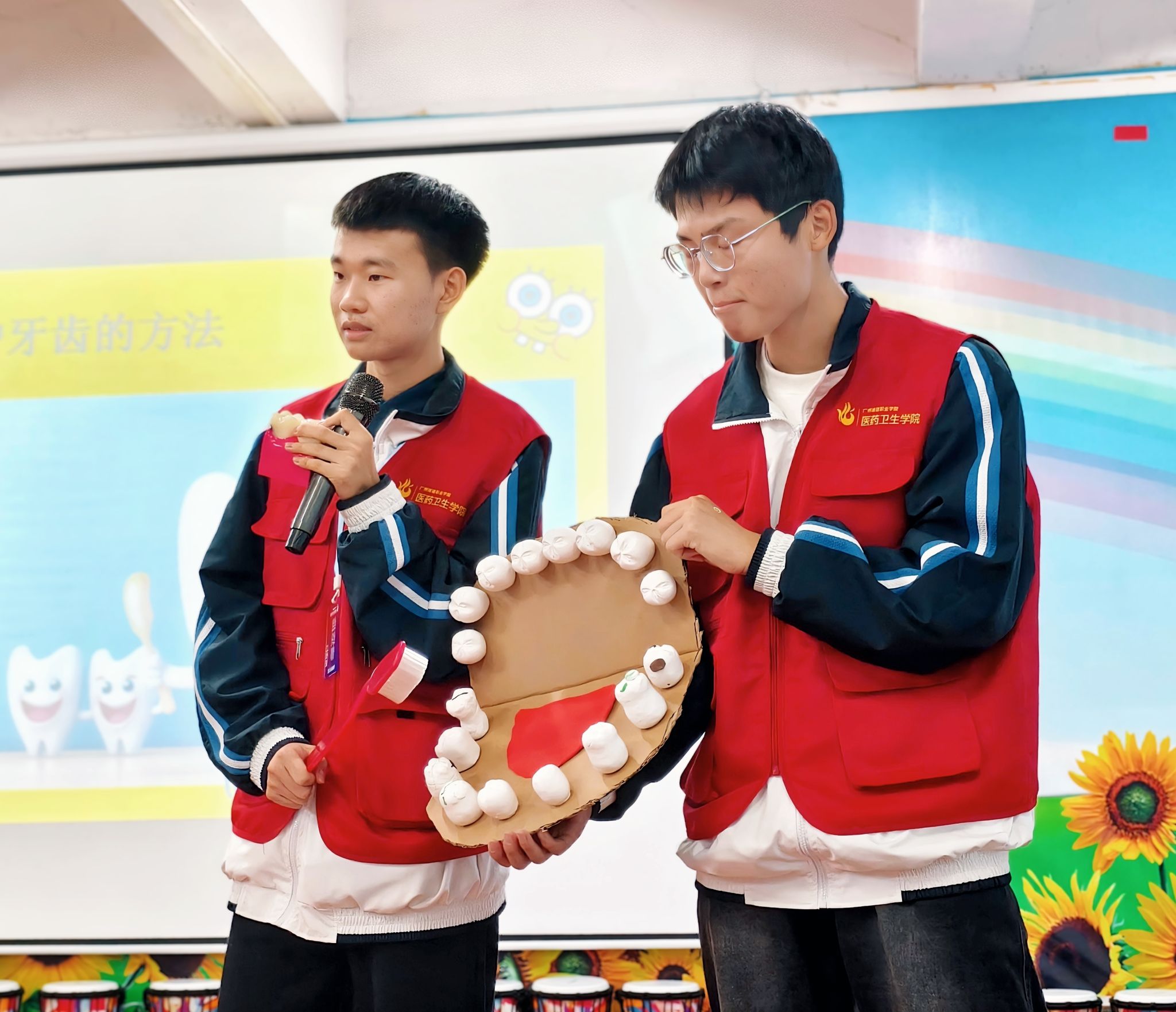 在刷牙方法教学环节,还设计了趣味互动形式,口腔专业的志愿者们细致入微地演示正确刷牙步骤,在视频、音乐、顺口溜的指导下,号召幼儿们积极刷牙,在实践中掌握正确的刷牙技巧。