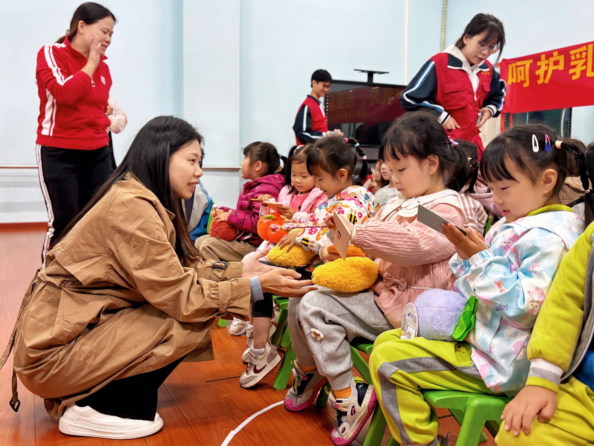 活动前期,员工志愿者结合幼儿认知特点,精心筹备教学内容与形式,以确保知识传递的有效性。在课堂上,志愿者们运用活泼生动的语言向幼儿们宣讲口腔知识。